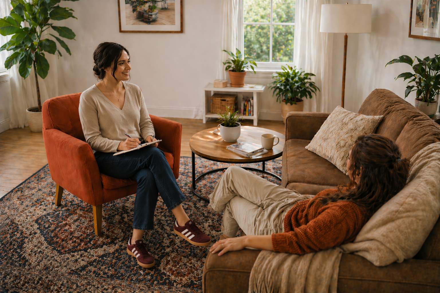 Pas de protocole rigide. Pas de case à cocher. Une première séance pour qu'on se rencontre, que tu poses ce que tu portes, et qu'on voit ensemble ce dont tu as besoin. Tout se passe en viso — confidentiel, souple, à ton rythme.
